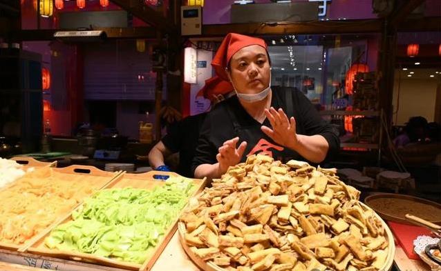 每当夜幕降临,敦煌夜市里灯火一盏接一盏亮起,淡淡的烟火气缓缓升起。游客们手里拿着各种食物,有的站着,有的坐着,慢慢品尝。欢笑声和食物的香气混在一起,组成了沙州食驿特有的热闹景象。