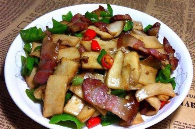 二、腊肉炒杏鲍菇:腊肉炒杏鲍菇是一道以腊肉和鲜嫩的杏鲍菇为主料,经过炒制而成的菜品。腊肉的咸香与杏鲍菇的鲜美相融合,口感鲜嫩,风味独特,是一道美味下饭的家常菜肴。