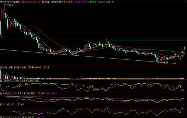 二零二一年一月,寒武纪刚上市没多久,还算是个新面孔。股价在上市后不久就开始往下走,日线图上显得有些疲软,二十五日均线也跟着下滑。那个时候,图形上短期指标有点共振向上的意思,有人觉得可以试着做个短线,趁回调靠近均线时进去碰碰运气。结果呢,买进去以后,行情像过山车一样,连续几次小波动才勉强稳住位置。