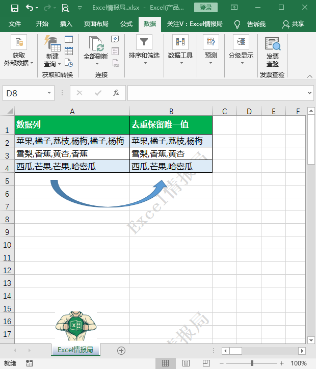 小伙伴们大家好,今天我们继续学习Excel职场技巧:如何将单元格内部数据去重提取唯一值?以前小编整理过相关类似的问题,一般我们会采取Excel基础函数或者是VBA代码等方法来解决此类问题。今天呢我们来尝试使用Power Query 中的M函数,原理清晰简单,操作易于上手,可快速的实现最终效果。