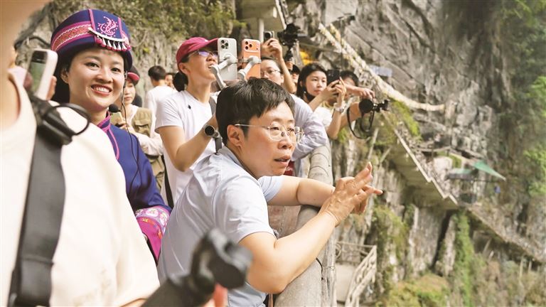 罗城讯 4月11日,“跟着蒙曼走读广西”文化主题活动走进罗城仫佬族自治县,中央民族大学历史文化学院教授、知名文化学者蒙曼与广西区内文化名家一行深入罗城天门山景区、棉花天坑景区,在山水间品读自然生态之美,在特色文旅体验中解锁罗城文旅融合新亮点。