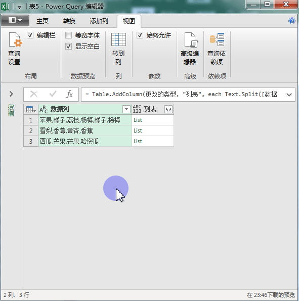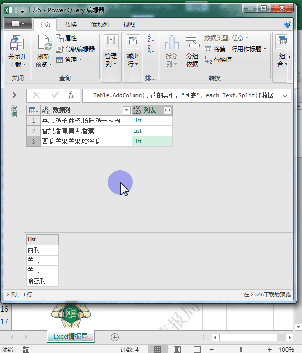从由逗号"," 分隔的文本值 "苹果,橘子,荔枝,杨梅,橘子,杨梅" 创建列表。