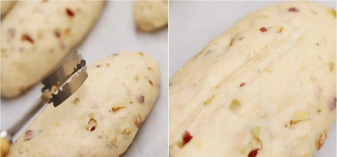 最后,软化的黄油装入裱花袋,在划好的口子里挤上细细的一条黄油。