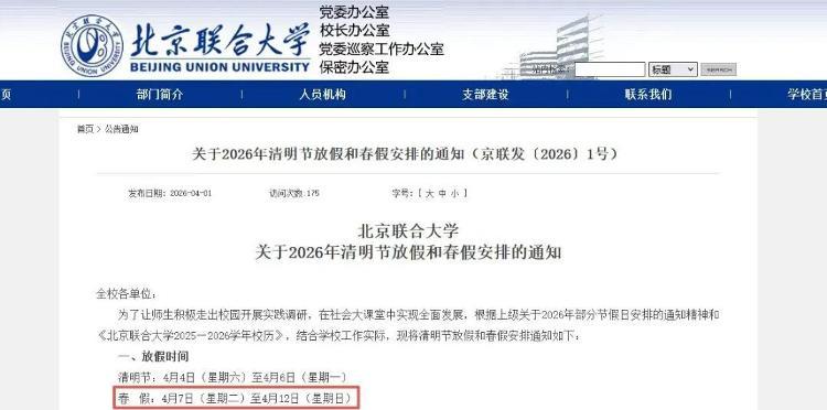 北京联合大学关于2026年清明节放假和春假安排的通知:春假放假时间为4月7日(星期二)至4月12日(星期日)。