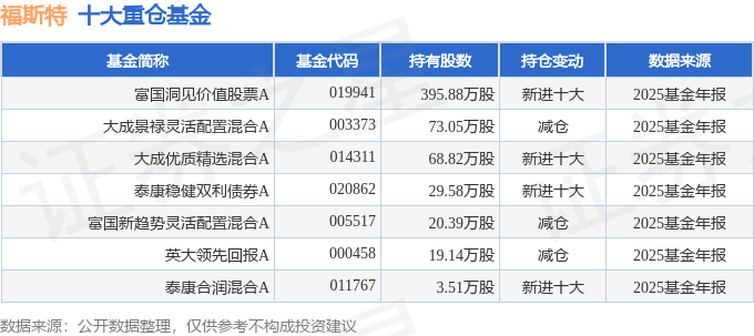 持有福斯特最多的基金为富国洞见价值股票A,目前规模为6.34亿元,最新净值1.5443(4月9日),较上一交易日下跌0.48%,近一年上涨56.64%。该基金现任基金经理为白冰洋。
