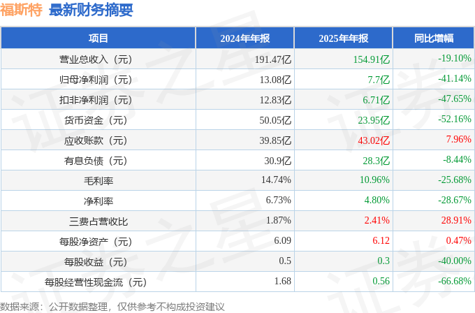 据证券之星公开数据整理,近期福斯特(603806)发布2025年年报。截至本报告期末,公司营业总收入154.91亿元,同比下降19.1%,归母净利润7.7亿元,同比下降41.14%。按单季度数据看,第四季度营业总收入37.03亿元,同比下降6.8%,第四季度归母净利润8207.82万元,同比上升65.7%。本报告期福斯特公司应收账款体量较大,当期应收账款占最新年报归母净利润比达559%。