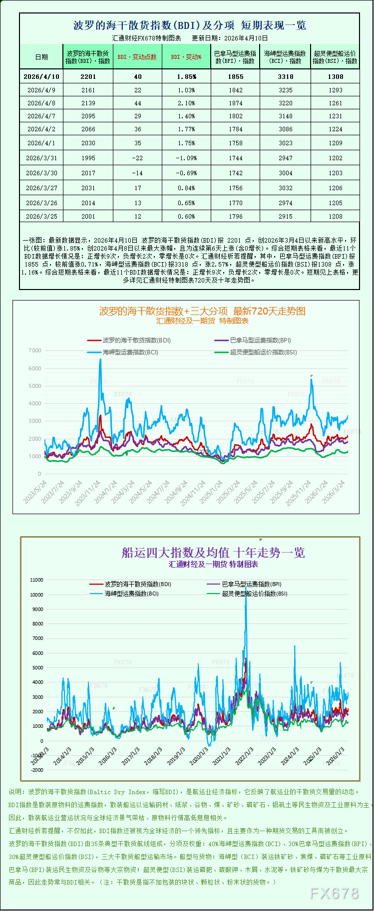 最新数据显示,2026年4月10日 波罗的海干散货指数(BDI)报 2201 点,创2026年3月4日以来新高水平,环比(较前值)涨1.85%,创2026年4月8日以来最大涨幅,且为连续第6天上涨(含0增长)。综合短期表格来看,最近11个BDI数据增长情况是:正增长9次,负增长2次,零增长是0次。其中,巴拿马型运费指数(BPI)报1855 点,较前值涨0.71%,海岬型运费指数(BCI)报3318 点,涨2.57%,超灵便型船运价指数(BSI)报1308 点,涨1.16%。波罗的海干散货指数+三大分项的最新720天走势图、十年走势图等详见汇通财经特制图表。