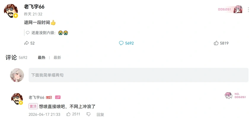 为什么播到现在我突然绷不住了。以前没有什么人骂我,就最近不知道为什么那么多人骂我。我不知道我到底干了什么错事,一堆人骂我。我就受不了这个。你们可以说我巨婴,可以说我心态差、玻璃心,但我觉得人与人之间就是不一样。我tm的就是这个心态。