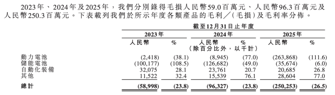 核心问题在于,清陶能源的毛利率持续为负且有所下滑:2023年到2025年,公司的整体毛利率分别为-23.8%、-23.8%、-26.5%。