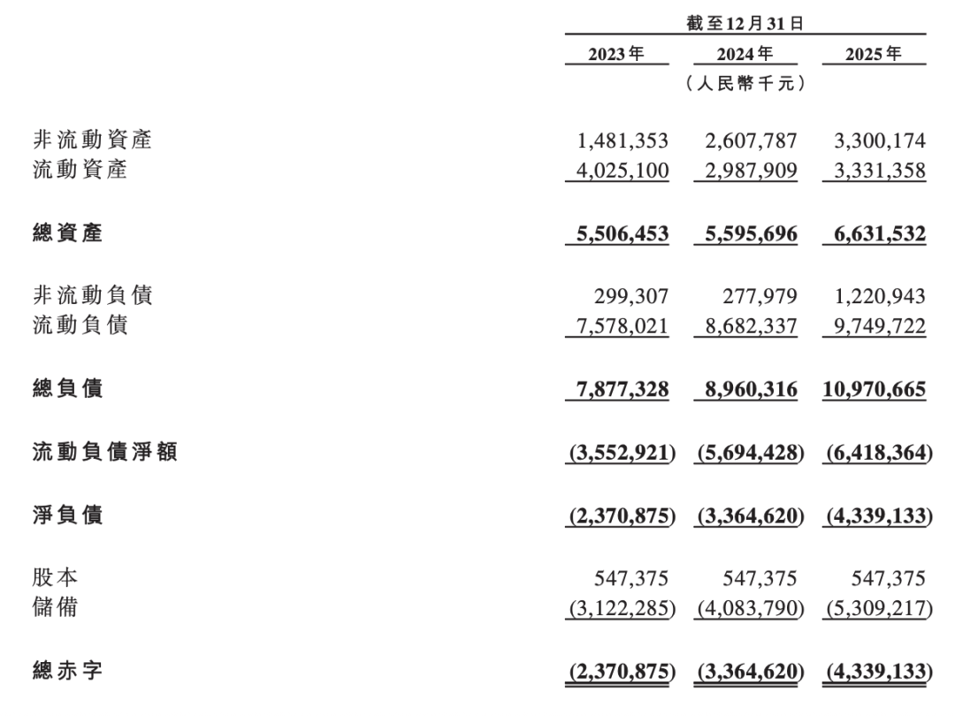 同时,公司资不抵债的程度也在加深。截至2025年末,清陶能源的总资产66.32亿元,总负债109.71亿元,总赤字达43.39亿元,较2023年的23.71亿元近乎翻倍。
