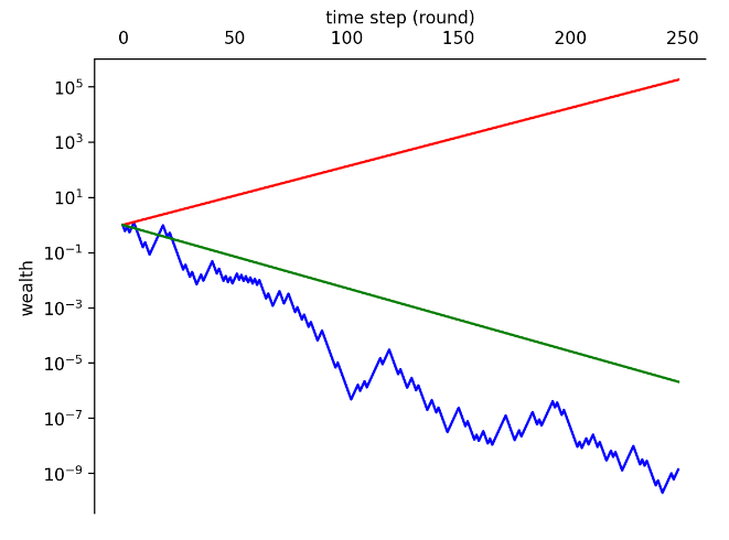 这就是"非遍历性经济学"的典型图像。红线和绿线代表着单一系统随时间影响的期望值,而实际蓝线才是正反皆有的客观反映。