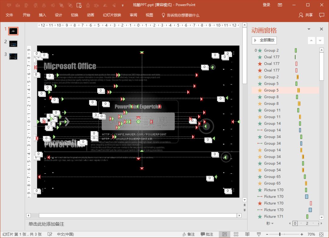 下图为在网上流传的“韩国炫酷PPT”,这份PPT虽然仅仅只有3页,动画效果却十分复杂,页面上每一个元素都应用了多个动画效果,其主要目的在于展示动画本身。而我们的日常工作、学习PPT主要目的在于表达内容,用简单的几个常用动画效果辅助演说即可。