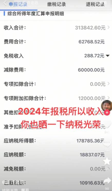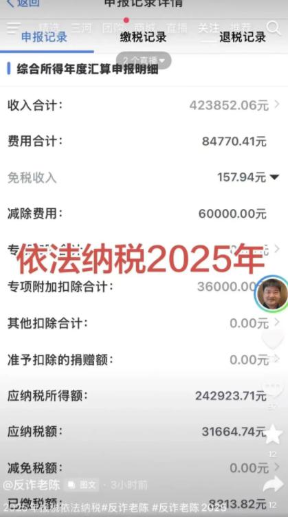 网红老陈晒出 25 年收入,近三年来创下新高,完全是小康生活,最近,网红反诈老陈主动晒出 2025 年全年收入纳税截图,再次把自己推上舆论中心,数据显示,他全年收入约 42.38 万元,应纳税 3.16 万元,仍需补缴 2.33 万元,算下来,年净收入约 39 万元,月均超过 3 万元。
