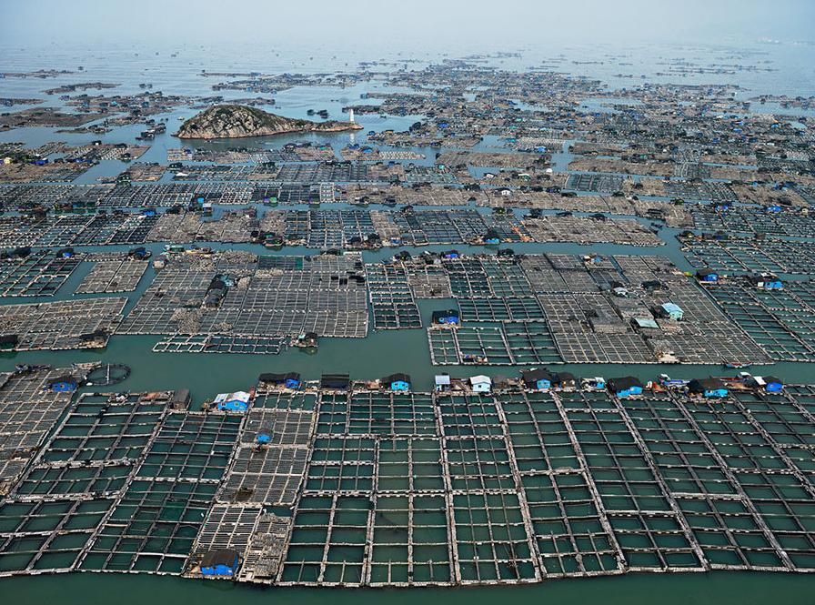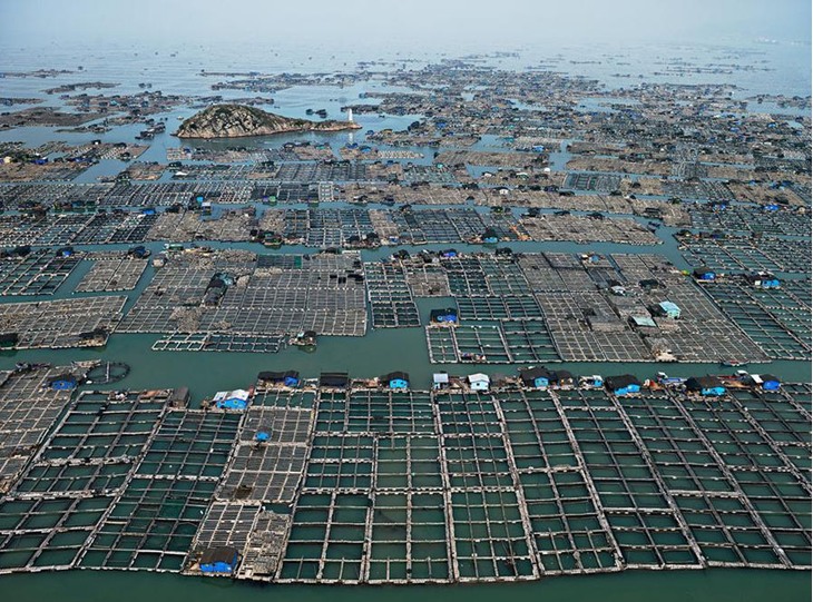 图为2012年,中国福建省罗源湾的海水养殖地。随着当地养殖业的发展,罗源湾海域形成了一道独特景观