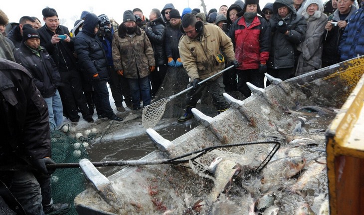 哈尔滨冬捕冰钓开铲车“捞鱼”万斤