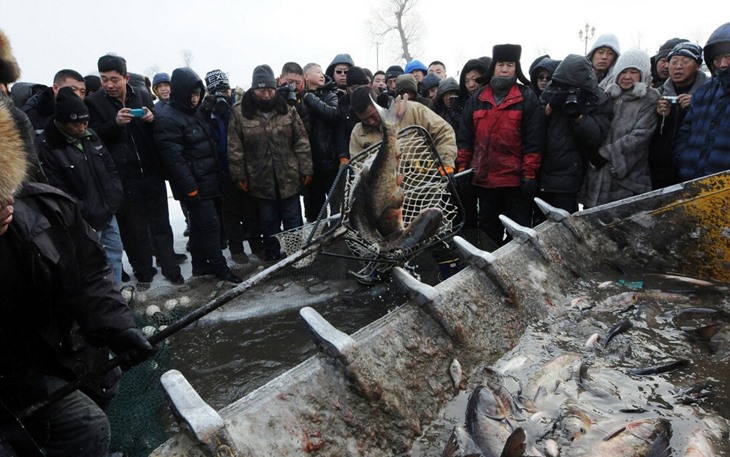 哈尔滨冬捕冰钓开铲车“捞鱼”万斤
