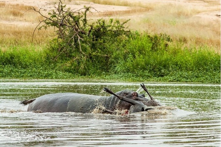 非洲河马与鳄鱼搏斗救牛羚