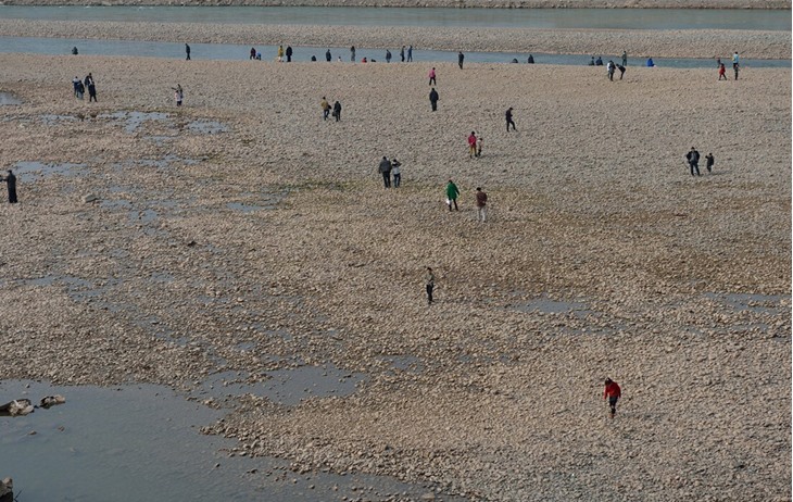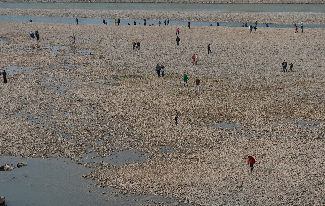 兰州黄河水位下降"露底" 市民在河心捡石头