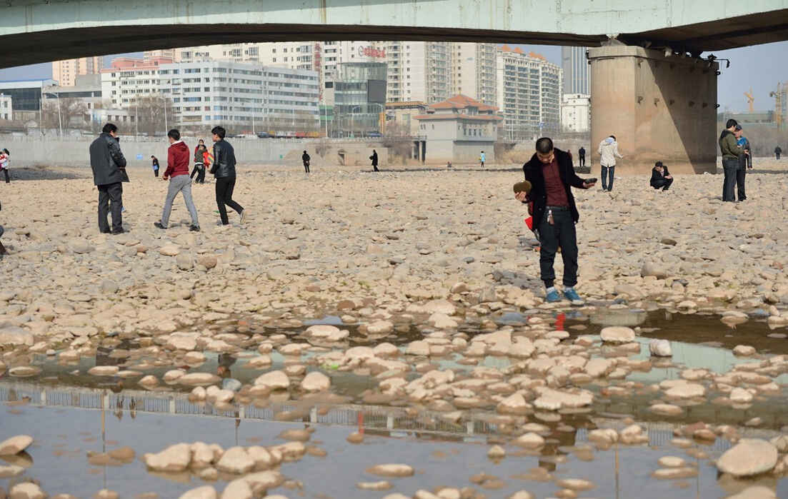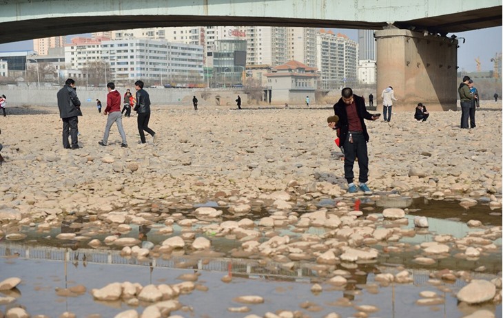 兰州黄河水位下降"露底" 市民在河心捡石头