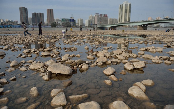 兰州黄河水位下降"露底" 市民在河心捡石头