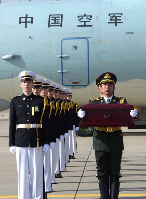 中韩交接志愿军烈士遗骸 国产歼-11B战机挂弹护送